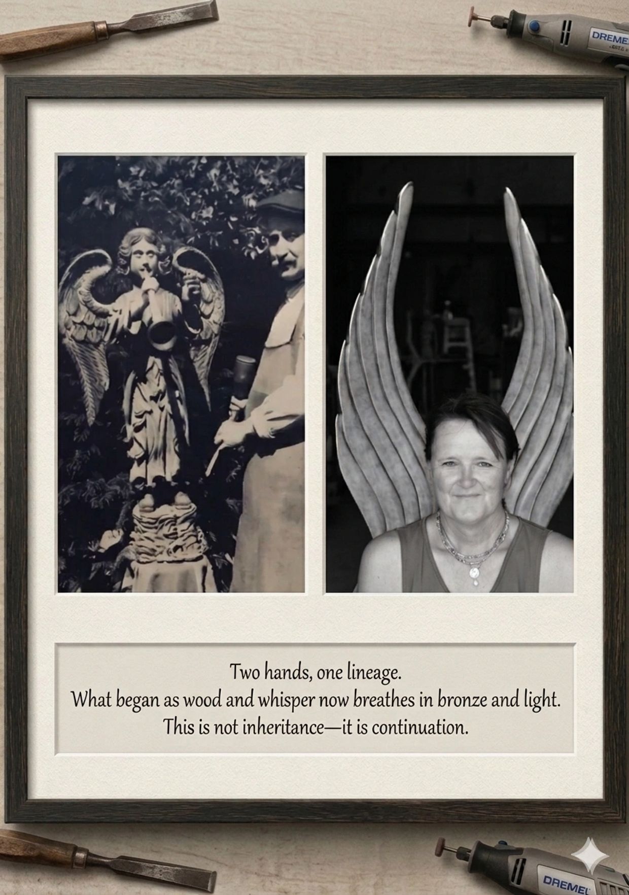 My journey began in the presence of my grandfather’s wooden carvings—sacred forms that whispered of angels long before I knew their names. These carvings still grace local churches, but their true legacy lives in my hands.